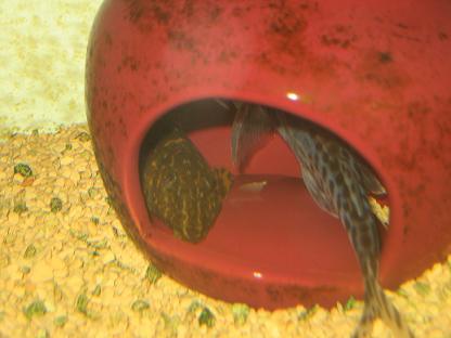 以前まで写真に写る壺はタイガーの棲みかでしたが、ピクタスに奪われてからというものもう長く居場所に困り放浪していたんですが、先日見てみるとピクタスが近づけば直ぐに逃げていたはずのタイガーが壺に収まっていました。