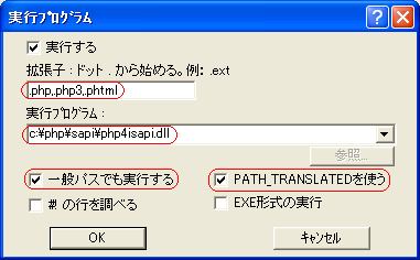 ただしphp.exeを使う場合c:\php\sapi\php4isapi.dllではなくc:\php\php.exeとします。